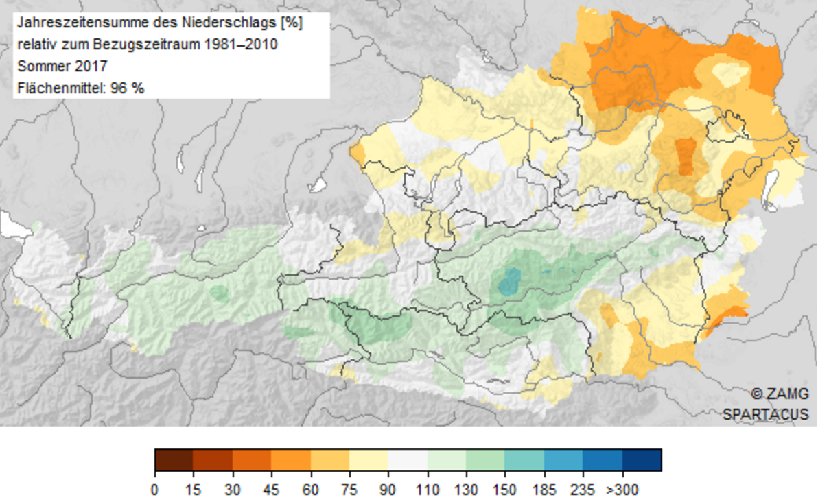 Doch verlassen wir nun den Bereich der Temperatur und widmen uns dem Niederschlag. Man sagt ja, Dürre ist der Hitze Schwester – trifft das heuer auch zu? Nun, pauschal lässt sich diese Frage weder mit „ja“ noch mit „nein“ beantworten, aus einem einfachen Grund: Je nach Region war der Sommer entweder extrem trocken oder extrem nass. Bis zu 50% weniger Niederschlag im Wald- und Weinviertel stehen bis zu 60% mehr Niederschlag etwa im Salzburger Lungau und der westlichen Obersteiermark gegenüber. Damit zählt dieser Sommer im Nordosten (Wald-, Weinviertel, Wien, Nordburgenland) zu den trockensten, während er in weiten Teilen des Bergland unter den nassesten rangiert.