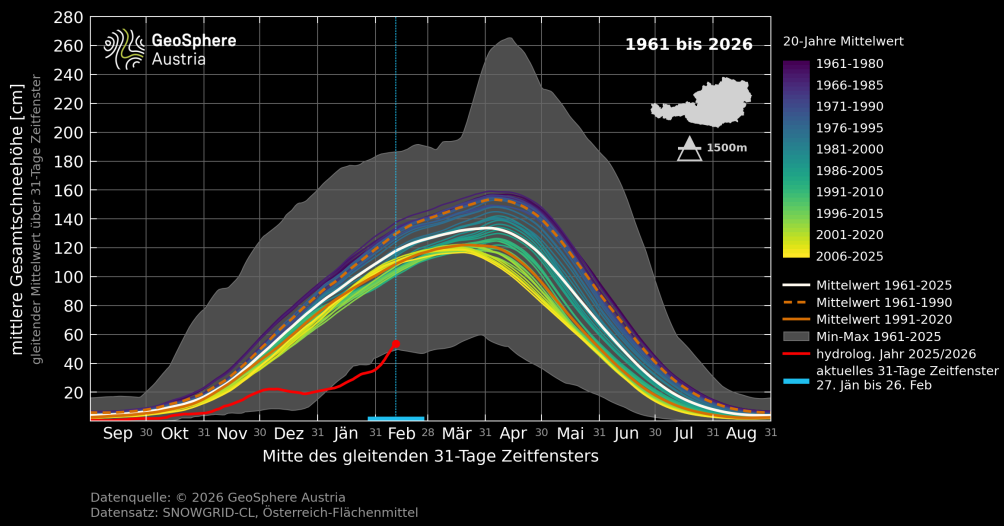 Wir hatten also im Flachland die etwas paradoxe Situation, dass es bei signifikant weniger Neuschneemenge überproportional viele Schneedeckentage gegeben hat: In Wien (W) zum Beispiel rund 50 % mehr Tage mit Schneedecke bei lediglich 1/3 der monatlichen Neuschneemenge. Oder Eisenstadt (B), wo gleich doppelt so viele Jännertage schneebedeckt waren (als gewöhnlich) bei nur der Hälfte der sonst üblichen Schneemenge. Das Flachland wusste halt jede Schneeflocke auch effizient zu nützen ;) doch am Ende bleibt auch der Jänner markant hinter den Schnee-Erwartungen zurück, besonders schmerzhaft einmal mehr auf unseren Bergen: Am Hohen Sonnblick (S) beträgt das Jänner-Minus 53 %, auf der Rudolfshütte (S) 65 %, am Galzig (T) 22 %, am Pitztaler Gletscher (T) 28 % und auf der Rax (NÖ) 59 %. Das Ergebnis: Anfang Februar – also zum Beginn der Semesterferien – war gut 90 % der Fläche Österreich schneebedeckt, die Dicke der Schneedecke war allerdings auf einem außergewöhnlich niedrigen Niveau. Selbst im Hochgebirge wurden Negativrekorde verzeichnet, wie etwa auf der Rudolfshütte in den Salzburger Tauern, wo am 01. Feber eine Gesamtschneehöhe von lediglich 63 cm gemessen wurde – der geringste Wert seit Messbeginn 1962.