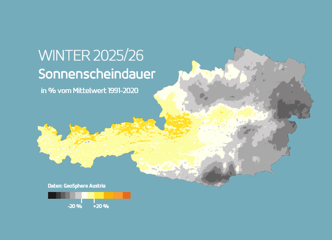 Wintertage brachte beispielsweise in Wien, St. Pölten, Eisenstadt und Klagenfurt kein einziges Sonnenminütchen, verlief also durchgehend grau. Das Flachland ist ja Hochnebel an sich gewöhnt, das heuer war aber selbst für die hartgesottenen Niederungen ungewöhnlich; Vergleichbares hat es zuletzt in den 70ern des letzten Jahrhunderts gegeben. Im gesamten Bergland allerdings schließt der Winter (hauptsächlich bedingt durch die andauernde Hochdrucklage im Dezember) überdurchschnittlich sonnig ab.